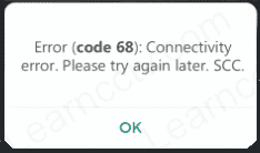 You can see the error when the following message pops up “Error (code 68): Connectivity error. Please try again later. SCC“.