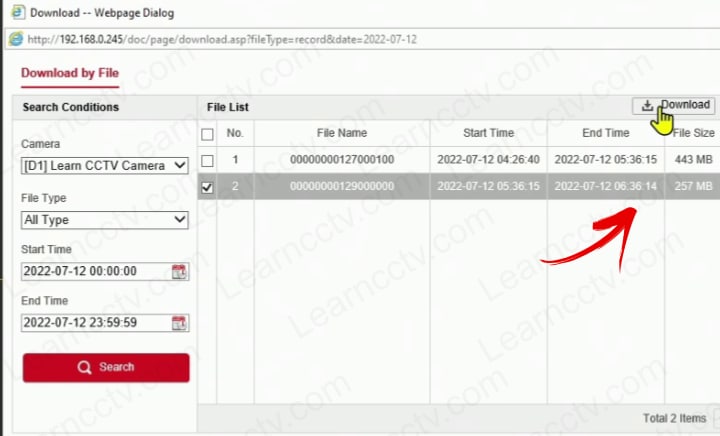 Type the NVR IP address on the web browser search page and enter your credentials, then open the playback menu and select the footage you want to download to your PC.