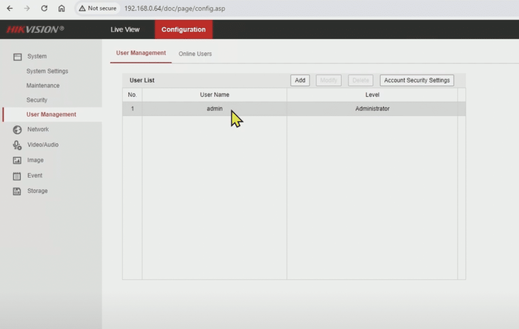 Once in the configuration settings, find the ‘User Management’ section. This is where you’ll manage the users associated with your device. In the tutorial, the presenter demonstrates the process using a default ‘admin’ user, but you might have additional users depending on your setup.