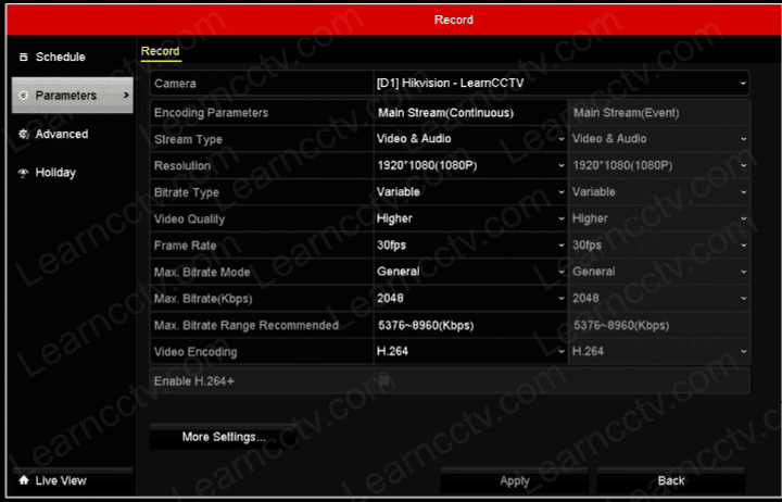 The picture below shows an example of a Hikvision NVR settings for recording.
