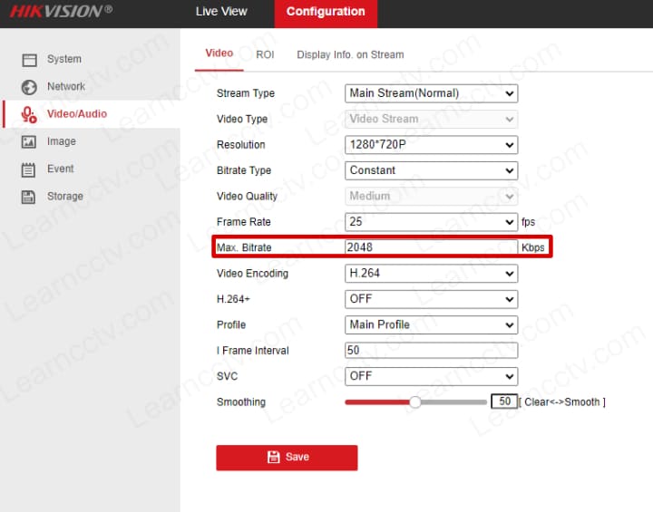 Try finding the configuration; under video settings, you should find the bit rate and have access to changing it. It might also fall under Streaming or Image settings if it is not under video configurations. I have attached an example using a Hikvision device and going into settings.